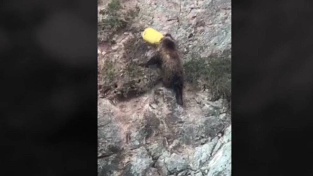 La policía libera a un oso pardo que tenía la cabeza atascada en un cubo