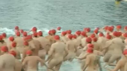 Cerca de dos mil personas esperan en la orilla la señal de los socorristas. Todos tapados con una toalla para evitar el gélido viento. Pero todo cambia cuando las bombas de humo naranja les indican que tienen vía libre: toallas fuera y... ¡al agua, patos!