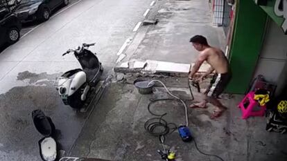 El pasado 27 de junio, un joven sufrió una fuerte descarga eléctrica mientras lavaba su moto en la ciudad china de Nanning. Tras dejar la manguera con la que había estado limpiando el vehículo, agarró el cable de un compresor con las manos mojadas y recibió una fuerte carga de electricidad durante aproximadamente 20 segundos. Las cámaras de seguridad captaron el instante en el que el hombre sufrió la descarga y el momento en el que logró salvarse tras desenchufar el compresor de la corriente.