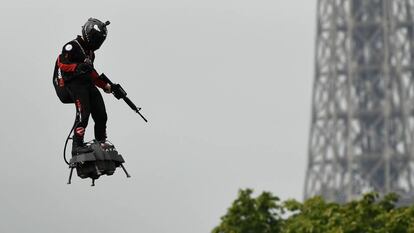 El responsable de esta atracción fue el campeón del mundo de jet-ski francés, Franky Zapata, que sobrevoló la tribuna presidencial con el Flyboard, una plataforma volante que ha inventado el propio deportista y que, según la ministra de Defensa francesa, Florence Parly, puede tener un gran futuro militar. El dispositivo, propulsado por cinco turborreactores de aire alimentados con queroseno que permiten alcanzar hasta 190 kilómetros por hora, “permitirá probar diferentes usos, como por ejemplo, una plataforma logística volante o bien una plataforma de asalto” para los militares, dijo Parly en la emisora France Inter.