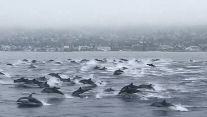 Chuck Patterson navegaba el pasado sábado por la costa de Laguna Beach (California, Estados Unidos) para practicar surf con hidroala (una quilla que eleva la tabla para evitar la fricción con la superficie del agua), cuando de repente vio cómo una manada de delfines comenzaba a seguir su estela. Según calcula el propio surfista, que logró grabar la insólita imagen en vídeo, más de 100 ejemplares rodearon su embarcación. "Parecían muy felices; se podía sentir su energía", aseguró Patterson, según recoge la agencia Reuters.