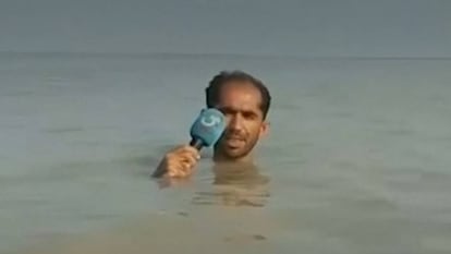 Un reportero informa con el agua hasta el cuello de las inundaciones de Pakistán