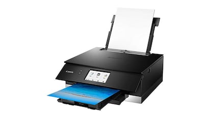 Con un diseño algo más grande que otras propuestas elegidas para esta comparativa, el multifunción de Canon imprime, copia y escanea. En color negro y detalles en plata, su estética es muy sencilla. Cuenta con un botón retroiluminado para encenderlo y apagarlo, así como una pantalla táctil a color de 10,8 centímetros. Responde a la perfección al toque sobre su superficie, la legibilidad es excepcional y desplazarse a través de las opciones de su menú resulta intuitivo. Por ejemplo, el acceso a la función de copia es instantáneo. También la de escaneo. Así, el documento a escanear puede guardarse en el ordenador, adjuntarlo a una dirección de correo electrónico o almacenarlo en la nube. Desde esta pantalla, además, es posible consultar el nivel de tinta del equipo y una guía rápida con información de interés.