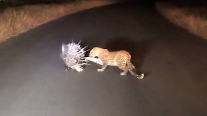 El pasado 19 de julio, Gerrit Meyer, un guardabosques sudafricano, capturó el momento en el que un leopardo intenta cazar a un puercoespín. Las imágenes fueron grabadas en el Parque Nacional Kruger, al noreste del país austral, y se han vuelto virales desde su publicación a principios de este mes. En el vídeo de cuatro minutos, el felino intenta hundir sus colmillos y garras en el cuerpo del puercoespín, pero la armadura de púas del roedor resulta impenetrable. Después de varios intentos, y tras dañarse el hocico, el leopardo se retira resignado. "Esta es la segunda vez que veo esto después de 25 años como guardabosques", comentó el guardabosques a la agencia británica Caters News. "Todos están asombrados y felices de haberlo visto, ya que es raro tener una visión tan clara de este tipo de interacción".