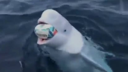 Una ballena beluga juega al rugby con un marinero en mitad del océano