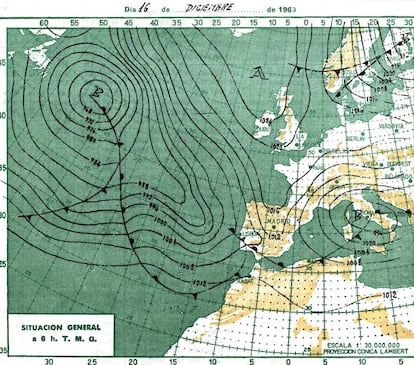Aquella mañana, la del 17 de diciembre de 1963, el personal de guardia en el Observatorio de Calamocha-Fuentes Claras (Teruel) tuvo que recurrir a un soplete para abrir la verja de la estación meteorológica. Todo se había petrificado con la descomunal helada, vistiendo totalmente de blanco el páramo turolense, en un paisaje que evocaba a las estepas rusas. Horas antes, Manuel Villamón, uno de los observadores, había anotado una temperatura de -21ºC a la una de la madrugada y -28ºC a las siete. Finalmente, tras acceder soplete en mano a la garita de los termómetros, se comprobó que la mínima había sido de -30ºC, temperatura reconocida desde entonces por Aemet como récord oficial de frío en zonas pobladas de España. Villamón, a sus 90 años, esboza hoy una sonrisa al recordar con nostalgia esa época, en la que era habitual que en los turnos de Nochevieja dejaran el champán a la intemperie hasta el momento de las uvas: “Ese 17 de diciembre, después de apuntar los -30 ºC, pensé si me habría equivocado, pero me convencí de que no al entrar en el centro de comunicaciones y comprobar que tenía el bigote escarchado”, declara a EL PAÍS.