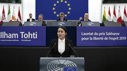 Jewher Ilham, hija de Ilham Tohti, el académico uigur condenado a cadena perpetua en China e incomunicado desde 2017, ha recogido este miércoles en su nombre el premio Sájarov a la libertad de conciencia que concede cada año el Parlamento Europeo, por defender los derechos de esa minoría musulmana china, a la que el régimen reprime con virulencia.