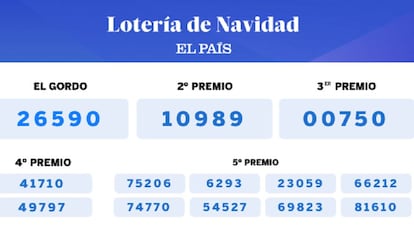 El 26590 es el premio Gordo del Sorteo Extraordinario de la Lotería de Navidad 2019, que ha tocado en Alcoi, San Vicente del Raspeig y Moraira (Alicante); Barcelona capital y Súria (Barcelona); Beniaján y Las Torres de Cotillas (Murcia); Salamanca, Sevilla, Salou (Tarragona) y Madrid. Ochenta de las 90 series vendidas en Salou fueron adquiridas por el centro El Cachirulo de Reus (Tarragona). En Salamanca, el club de yudo Seiza ha repartido 100 millones en participaciones. El segundo premio es el 10989, distribuido mayoritariamente en Madrid y en San Lorenzo del Escorial. El tercer premio ha recaído en el 00750, consignado en Ripoll (Girona) y Almuñécar (Granada), que devolvió 30 de las 40 series porque al público no le gustaba un número "tan bajito". El 41710, el primer cuarto premio cantado, se ha ido a Utrera (Sevilla) casi entero. El número corresponde al código postal del pueblo. Y el otro cuarto premio es el 49797, vendido íntegramente en Cataluña. Los ocho quintos premios han recaído en los números: 75206, 6293, 23059, 66212, 74770, 54527, 69823 y 81610. Así le hemos contado en directo el sorteo y las celebraciones de los agraciados. Para comprobar la lista de premios, pinche aquí.
