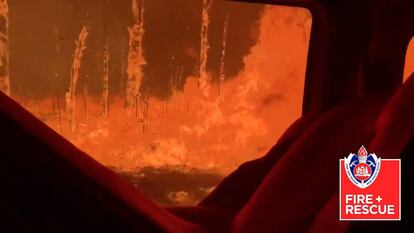 El departamento de bomberos de Nueva Gales del Sur ha publicado este martes un vídeo en el que muestra a uno de sus coches adentrándose en el incendio forestal de Currowan, que arde en la ciudad de Nowra, Australia. En las imágenes tomadas desde el interior del vehículo, se puede ver las llamas que rodean al camión a medida que avanza a través del fuego. La visibilidad del conductor se reduce a tan solo unos metros a medida que continúan circulando lentamente por una carretera. En un momento, la tripulación se ve forzada a colocar una alfombra protectora contra sus ventanas para evitar que el fuego atraviese el coche.