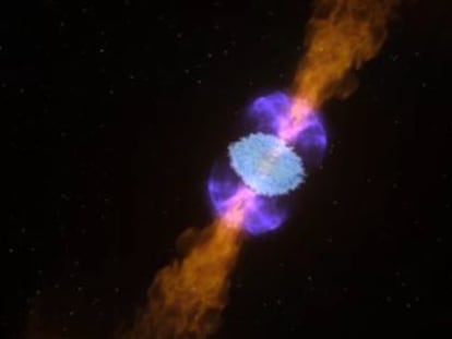 Todo sucedió a una distancia de 500 millones de años luz de la Tierra o, lo que es lo mismo, hace 500 millones de años, cuando los primeros animales —milpiés del tamaño de un dedo— comenzaban a moverse por nuestro planeta. Cuando las estrellas más grandes que el Sol agotan todo su combustible, explotan en potentes supernovas. Las capas externas de la estrella salen despedidas esparciendo por el universo elementos químicos esenciales para la vida. Mientras, la corteza interior del astro se desploma sobre sí misma y los protones y los electrones se aplastan unos contra otros hasta convertirse en neutrones. La estrella queda transformada en una esfera que concentra más masa que el Sol, pero que tiene apenas un diámetro de 10 kilómetros. Cada cucharadita de estrella de neutrones pesa más de mil millones de toneladas.
