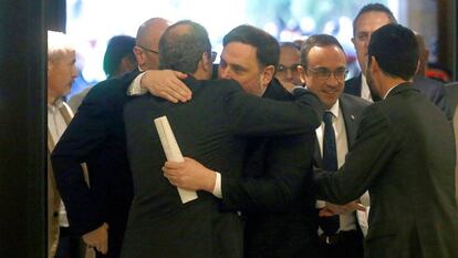 Entre aplausos y gritos de “llibertat presos polítics”. Así ha sido la llegada al Parlament de Oriol Junqueras, exvicepresidente de la Generalitat, y de los otros exconsejeros que hoy comparecen en la comisión de investigación sobre los efectos de la aplicación del artículo 155 de la Constitución en Cataluña. Los presos salieron cerca de las 07.30 de la mañana de la cárcel de Lledoners, y una hora más tarde han sido recibidos a la puerta del Parlament por Quim Torra, presidente de la Generalitat, y Roger Torrent, presidente del Parlament. Dentro del edificio, decenas de personas les esperaban para aplaudirles al grito de “llibertat” mientras se dirigían a la sala donde tiene lugar la comparecencia. Los Mossos están encargados del dispositivo de seguridad que incluye a cada uno de los políticos presos y a cinco personas a su disposición —miembros de los grupos parlamentarios y asesores— que se encargan de ayudarles con su comparecencia. Se les ha hbailitado, además, una zona para que puedan esperar mientras son llamados a comparecer. Los miembros del Govern cesado cumplen penas de entre 9 y 13 años de cárcel tras la condena del Tribunal Supremo por delitos de sedición y malversación.