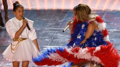 La niña, de 11 años y nacida de la relación entre la cantante y Marc Anthony, cantó en el intermedio del espectáculo deportivo 'Born in the USA', el himno de Bruce Springsteen