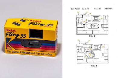 Ya en 1969, Hubert Nerwin proponía la posibilidad de construir la carcasa de su última creación para Kodak en un material barato, como el cartón, para que pudiera utilizarse de forma desechable. Pero no fue hasta mediados de los ochenta cuando Fuji patentó su Quick Snap y Kodak hizo lo propio con la Fling 35 (en la foto de la izquierda). La de la imagen de la patente es una edición de Kodak de 1988 que permitía añadir un cuerpo con flash, de quita y pon y reutilizable. Para entonces ya existían también las desechables resistentes al agua. Lo más de lo más.