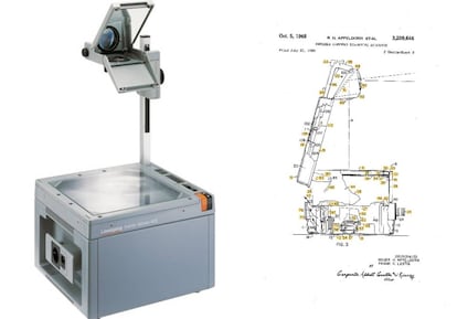 El de la patente, con cabeza elevada, es una edición de 1962 de 3M, una de las firmas que más retroproyectores vendieron a los centros educativos y de congresos en España. La de la foto, es la Liesegang Trainer Deluxe 400, que aún se puede comprar por poco más de 100 euros.
