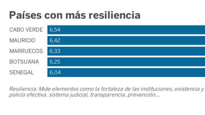 El resultado es que un tercio del continente se encuentra en una posición de vulnerabilidad extrema. "Solo once países cumplen las condiciones idóneas: poca criminalidad y alta resiliencia", recalca Adal. Son Botsuana, Cabo Verde, Etiopía, Ghana, Mauricio, Marruecos, Namibia, Ruanda, Senegal, Seichelles y Túnez.