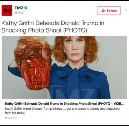 ¿Cómo acabó? CNN rescindió su contrato como presentadora del programa de Fin de año, el fabricante de retretes Squatty Potty la despidió como su imagen de marca y Sharon Stone le dijo que no le quedaría más remedio que abandonar el país durante ocho años. Griffin emitió una disculpa pública (“No creo que pueda tener una carrera después de esto, Trump me ha roto”) y canceló su gira ante las amenazas de muerte. Una de ellas la comparaba con Bill Cosby, se alegraba de la reciente muerte de su hermana por cáncer y deseaba que hubiera sido ella. El FBI la investigó por conspirar para atentar contra la vida del presidente. La Interpol la puso en su lista de personas peligrosas y no pudo coger aviones durante dos meses. Incluso durante su gira por Europa, con un show titulado Ríete hasta perder la cabeza, Griffin fue detenida durante horas en cada aeropuerto que pisaba. La humorista acabó retractándose de su disculpa, al considerar que ella había perdido más por aquella imagen-protesta que cualquier daño que pudiera haber hecho al presidente. Un mes después, Johnny Depp dijo durante el festival de Glastonbury “¿Cuándo fue la última vez que un actor asesinó un presidente?”, en referencia al magnicidio de Abraham Lincoln. “Ha pasado un tiempo y quizá ya va siendo hora”. Su comentario no tuvo ninguna consecuencia.