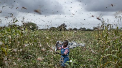 “¿Hasta cuándo? Primero la sequía, luego las inundaciones y ahora las langostas”. Francesco Rigamonti vive en Kenia desde hace cuatro años, es coordinador regional de Oxfam y así define las conversaciones que desde hace dos meses escucha a su alrededor. “Se está viviendo como una especie de plaga bíblica”, añade en una conversación por Skype. Un impactante brote de langostas del desierto asola al Cuerno de África desde finales del año pasado. Aunque ya ha afectado a 11 países del continente, su intensidad es mucho más elevada en tres de ellos, Kenia, Somalia y Etiopía,