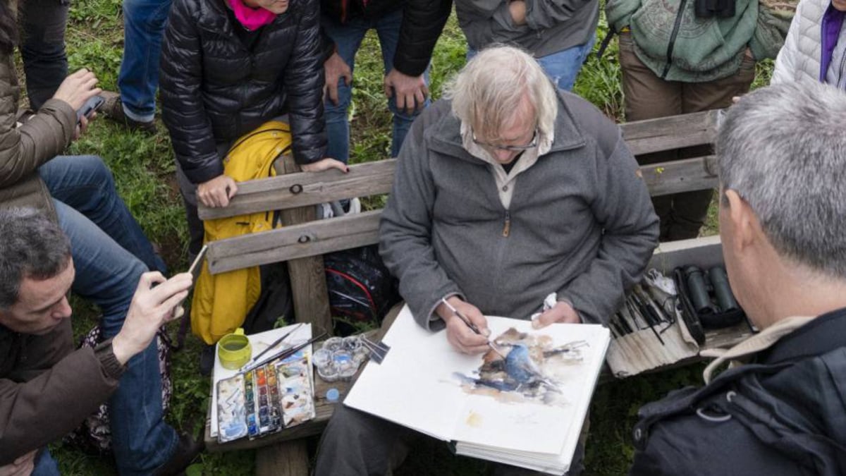 Bajo el poderoso vuelo de los buitres y las águilas, en el imponente mirador de la Portilla del Tiétar, en el parque nacional de Monfragüe (Cáceres), los visitantes se agolpan ante el umbral de un pequeño cobertizo de piedra instalado para observar aves. Con actitud reverente y cuchicheos de admiración, miran hacia el interior. Diríase que estamos en un santuario o en el recinto sagrado de un sadhu, un santón en el Himalaya. Al asomarte, lo que ves es a un hombre enorme de pelo cano sentado en un banco de madera, dibujando en un cuaderno. Frente a él hay un telescopio en un trípode, y a su lado, una caja de acuarelas y un hatillo con pinceles. Un chorro de luz entra por la amplia abertura del mirador nimbando al artista como en una anunciación renacentista e iluminando su dibujo: es un buitre leonado retratado con asombrosas habilidad y belleza.