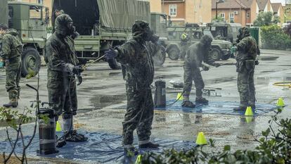 Es la sensación que tienen los paracaidistas mientras suben trabajosamente por las escaleras los cuatro pisos de la residencia. Se comunican con gestos. El procedimiento operacional NBQ implica descontaminar desde las plantas superiores hacia abajo. Y no acercarse de ninguna manera a la “zona caliente”, donde permanecen aislados los enfermos. Antes de acceder al edificio, los soldados se han desinfectado a conciencia. Se trata de que ningún patógeno entre o salga de la residencia. Cuantas veces accedan o abandonen el edificio, tendrán que repetir una farragosa operación que implica ser rociados de agua helada con lejía (“hiploclorito de sodio”, aclara un brigada), y lavarse el calzado, los guantes (que se retiran con maestría) y después las manos y la cara. Es el momento de quitarse la máscara y respirar aire fresco unos pocos minutos. Y volver dentro. “Aquí, aunque salgas a mear, te tienes que volver a descontaminar”, sentencia un paraca guasón.