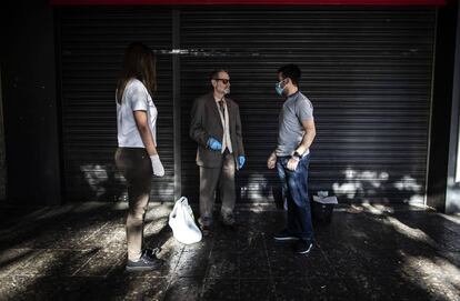 Al mismo tiempo, la pareja respondió al llamamiento de la asociación Bokatas, dedicada a la asistencia de personas sin hogar. Los acompañamos en su ronda. Los comedores sociales habían cerrado, no había viandantes y el cuenco con el que Santiago Pérez, 67 años, recoge monedas en la madrileña calle de Orense estaba vacío. La asociación decidió cambiar de método estos días: dejaron de repartir los bocadillos a través de los que habitualmente establecían contacto con los sin techo y empezaron a dar bolsas con comida para varios días. Desde entonces, González y Alaiz recorren Madrid cargados de pan, embutidos y conservas, que reparten a quienes, como Pérez, no pueden quedarse en casa. “La gente está siendo más solidaria. Se paran, me preguntan si necesito algo”, asegura Pérez, mientras chupa un purito. Alaiz concuerda con esta visión: “Yo respiro un intento por entender que no somos autosuficientes. Que nos necesitamos los unos a los otros”.