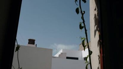 Precisamente es la vista al exterior desde la ventana de su casa lo que centra el corto de Karma. Un plano fijo bordeado por una planta trepadora, en el que el transcurrir del día atraviesa el de cielo que asoma sobre la azotea de enfrente, aderezado con la banda sonora de los ruidos cotidianos: el enjuague de dientes, el eco de los pasos sobre los adoquines sevillanos, el motor de los coches, una canción que no se sabe si procede de su propia casa o de una vecina…. 24 horas acotadas en apenas un minuto con la técnica del timelapse. “Quise representar ese cisma entre el espacio y el tiempo a través de mi ventana, porque era el único lugar por el que iba a poder ver y con la técnica del timelapse busqué reducir el tiempo de la vida cotidiana, que para algunos ya se ha terminado tal y como la conocían”, explica.