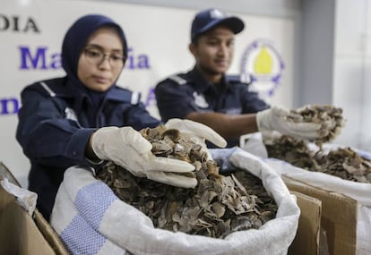 Hoy existe una demanda sin precedentes de sus escamas, fundamentalmente de países de Asia y África, donde el pangolín es usado como alimento y con fines rituales y medicinales. Entre 2017 y 2019 se triplicó el volumen de incautaciones de escamas de pangolín. Solo en 2019 se informó de que fueron interceptadas saliendo de África 97 toneladas de escamas, lo que equivale a 150.000 animales. Hay aún más pruebas que evidencian el tráfico ilegal que sufren, y a las que se puede acceder libremente a través de redes sociales como Facebook.