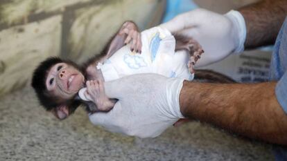 En la jaula de los monos, donde es normal que haya abortos, una hembra de babuino dio a luz, aunque no se ocupa mucho de la cría y el veterinario se la lleva a casa para alimentarla con leche.