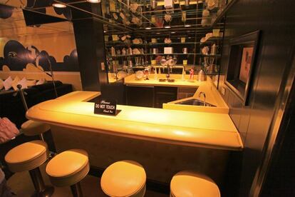 Al fondo de la sala, se encuentra el wet bar que contiene una pionera máquina de hielo Scotsman. Tras uno de los pocos cuadros de la casa se esconde un proyector, que transformaba la habitación en una sala de cine.