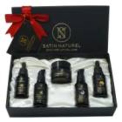 El lote viene con cinco productos envueltos en suave tela de satén para mejorar tus rutinas de belleza diaria: concentrado y crema de ácido hialurónicos, gel de aloe vera, aceite de argán y sérum. Todos ellos son artículos orgánicos.