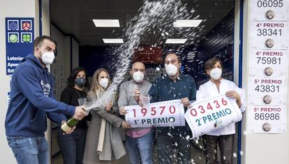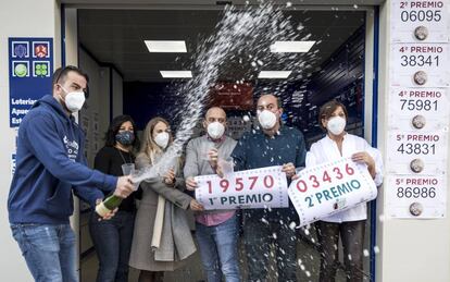 Celebración del primer premio del sorteo de El Niño en la administración El Gato Negro de Barcelona.Massimiliano MinocriCelebración del primer y segundo premio del sorteo de El Niño en Manises (Valencia).Mònica TorresLos dueños de la administración de la calle López Seña de Laredo (Cantabria) sostienen los carteles del primer premio.Albert LosaLos loteros Andrés (a la izquierda) y Benjamín celebran haber vendido el primer y tercer premio de la lotería de El Niño, en la adminitración El X de la Suerte de O Porriño (Pontevedra).Salvador de Sas (EFE)Despacho de Guadalcacín (Cádiz) que ha vendido parte del tercer premio del sorteo de lla otería de El Niño.Europa PressLa encargada de la administración de lotería, Mónica (en el centro), uno de los agraciados, Juanjo (a la derecha) y algunos amigos celebran el primer premio en la administración número 1 de Sallent (Barcelona).Susanna Sáez (EFE)Celebración del primer premio del sorteo de El Niño en una administración del paseo de Extremadura, en Madrid.ANDREA COMAS