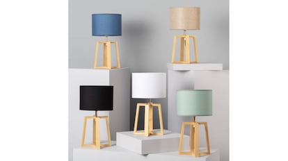 Disponibles en cuatro colores distintos (azul, beige, negro y verde), este es un producto que nos aportará una gran elegancia en la zona de la casa donde lo coloquemos. De tulipa ancha, la base está dividida en cuatro ángulos rectos y tiene un acabado en madera. La bombilla a utilizar es de tipo led modelo E27 y sus dimensiones son muy contenidas: 460 x 250 mm.