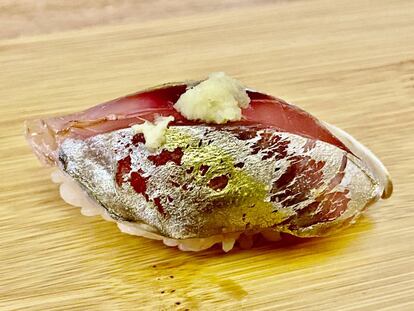 Llegaba el turno de los nigiris y de otros bocados afines. Sobre la mesa de corte aparecieron lascas finas de atún rojo cortadas al momento (akami en tataki); de chu toro más grasiento; de jurel de aleta amarilla, y de caballas marinadas con las que preparó un maki insólito, abundante en cebollino y jengibre, sin arroz en absoluto.