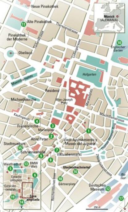 Subir las escaleras del Alter Peter (2) (Rindermarkt, 1; dos euros) ayuda con la digestión. Desde lo alto de la torre, las excelentes vistas descubren dos edificios clave del centro: la Marienplatz (3) y Frauenkirchen (4). En el subsuelo de Marienplatz acaban de comenzar las obras de remodelación de la estación de metro con un proyecto de iluminación del famoso Ingo Maurer que hará brillar un cambiante techo rojo con luces de led. Quedan al menos un par de años hasta que termine, pero mientras tanto, en la estación de Westfriedhof (5) se pueden admirar unas lámparas de aluminio de 3,8 metros de diámetro obra de Maurer, y en su showroom y tienda (6) (Kaiserstrasse, 47) se exponen más de cien piezas diseñadas por este virtuoso de la luz.