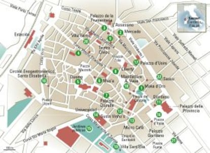 Para exprimir las proezas arquitectónicas de Sassari busque la Piazza Tola y tópese con el Palazzo d’Usini (17), fantástica expresión de arquitectura civil renacentista que acoge la biblioteca comunal. Y muy cerca, en Largo Cavalloti, se alza la fachada y las ventanas del negocio Manifatture A. Viale (18), brillante ejemplo del estilo Liberty (modernismo en Italia) cultivado por los hermanos Clemente. El Liberty tuvo mucho éxito en Sassari. Se puede seguir su rastro en Villa Sant’Elia (19) y Villa Farris (20).