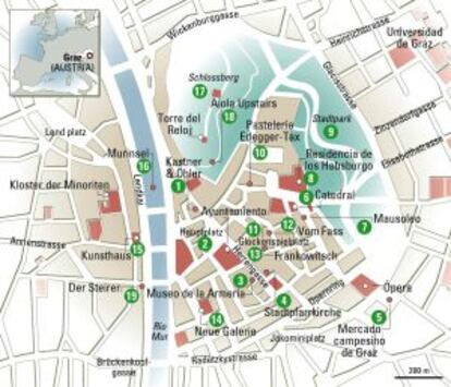 Desayunar en la cafetería de los grandes almacenes Kastner & Öhler (1) (Sackstraße, 7) es una de las mejores opciones para comenzar el día. Ubicada en el último piso, este espacio fue creado por los arquitectos españoles Fuensanta Nieto y Enrique Sobejano, responsables de la renovación de estos clásicos grandes almacenes. En primavera y verano cuenta con una terraza descubierta que ofrece una panorámica sobre los tejados de la ciudad y las mejores vistas del castillo y la Torre del Reloj, símbolo de Graz. A pocos metros de aquí se llega a la plaza central o Hauptplatz (2), donde está el ayuntamiento y la oficina de turismo.