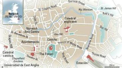 Situada a orillas del río Wensum y convertida hoy en ciudad de servicios, Norwich sí responde a la idea de “típica ciudad inglesa”, idea que incluye tanto Elm Hill, la más pintoresca calle de la localidad, con su calzada de cantos rodados y sus inclinadas casas medievales, empleada en varias ocasiones como decorado cinematográfico, como Prince of Wales Road, calle de locales nocturnos donde abundan los personajes dignos de un cameo en el reality de la cadena MTV Geordie Shore.
