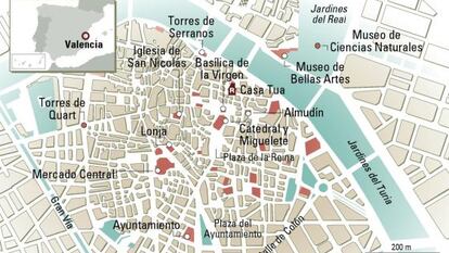 En el entorno catedralicio, el Micalet, su campanario, actúa como icono y referencia para los valencianos. Escuchar sus campanas, subir a las alturas y contemplar a vista de pájaro la ciudad es altamente recomendable. La basílica de la Virgen, la catedral, el edificio gótico de la Generalitat Valenciana y la plaza de la Almoina, centro del foro romano y lugar fundacional de Valencia, se sitúan a tiro de piedra.