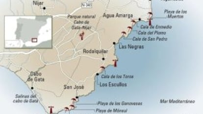 Caminatas de entre veinte minutos y una hora bajo el árido paisaje almeriense es el pequeño peaje que hay que pagar para acceder a muchas de las playas vírgenes del parque natural Cabo de Gata-Níjar. Un breve peregrinaje costero que concede la recompensa de baños en límpidas aguas y evocadores entornos rocosos, que contrastan con el concepto comodón de tumbona estampada en primera línea de playa. Aquí para gozar hay que sufrir (un poco), al menos para llegar a las playas más pequeñas (cala de Enmedio, cala de San Pedro, cala de los Toros...), p</CF>or senderos escarpados y con pobre señalización. El acceso a otras más concurridas, como Las Negras, Rodalquilar o la de los Genoveses, con aparcamientos en la mi</CF>sma arena, es en cambio mucho más sencillo.