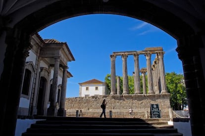 El callejeo nos lleva a la puerta de la Morería, lo mejor de un barrio con el mismo nombre pero que no merece más atención que un pequeño piscolabis en el Botequim da Mouraria (4). Deambulando entre callejucas —todas igual de bonitas, todas igual de limpias—, sale al encuentro la catedral (5). Es grande y extraña, más parece un castillo de los Windsor. Tampoco le va a la zaga la iglesia de Graça (6), con cuatro grandes hotentotes que guardan la fachada. No parecen santos ni demonios, más bien atlantes, aunque aquí les llaman Meninos. En ambos casos, lo mejor se ve desde fuera. Tampoco es preciso entrar en el Templo de Diana (7) porque esta columnata de los tiempos romanos (siglo I) es translúcida, y gracias, porque durante estos siglos ha servido para casi todo menos para Diana, de armería a matadero. Finalmente reluce como decorado fotográfico de la ciudad, en una plaza que mira hacia la vega.