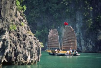 La bahía de Halong, al noreste de Vietnam, es el típico lugar que uno imagina en el mapa pirata del tesoro, con islotes que emergen del mar envueltos en la bruma, como monstruos mitológicos, y donde un sencillo barco de junco es el mejor vehículo para explorar este paraje de aspecto sobrenatural.