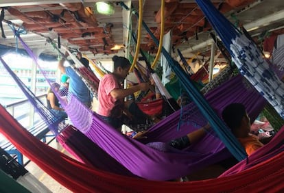 Rose, nacida en Pará, viene de Tabatinga, en el Amazonas, ciudad que queda en la triple frontera de Brasil, con Colombia y Perú, a 1.600 kilómetros en barco de Manaos. Dos días después de hablar conmigo, me dijo: “Ven aquí que vamos a depilar esas cejas”. Me tumbé en su hamaca y salí con una mirada “más abierta”, según dijo. Así, la creatividad va intentando vencer al ocio.
