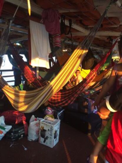 En la primera planta del barco había un coche, frigoríficos, fogones, camas, colchones y dos perros que eran transportados entre las hamacas de los pasajeros. Una escalerilla llevaba a la segunda planta, donde se apiñaban 124 hamacas colgadas y entrelazadas, decenas de maletas y mochilas, un baño en cada lado y una pequeña cocina al fondo. En el tercer piso estaba la cabina del comandante, un pequeño bar y sillas de plástico para disfrutar de la vista del río y algunas hamacas más que no cupieron en las plantas inferiores. Los altavoces del bar tocan tecnobrega y sertanejo ininterrumpidamentedesde las siete de la mañana hasta medianoche. La cerveza, que no está fría, distrajo y ayudó a hacer amigos durante los siguientes cuatro días.