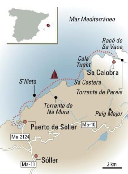 De nuevo a bordo, dos grandes farallones rocosos anuncian el Racó de Sa Vaca, una ensenada de aguas transparentes que esconde dos joyas de la Tramuntana: la cala de Sa Calobra y el torrente de Pareis, que parece una exótica playa de piedras, pero no lo es. Se trata de la salida al mar del barranco de Sa Fosca, uno de los muchos torrentes que horadan estas montañas, salvajes a pesar de todo.
