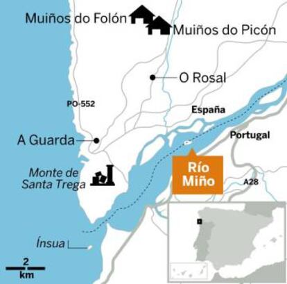 La ruta de los Muiños do Folón e do Picón (que así se dice en gallego y aparece en las señales) empieza y acaba en la carreterilla que une los lugares de Martín y Fornelos, a tres kilómetros de O Rosal. Al inicio del recorrido, en la parte más baja del mismo, hay un molino que se pone en marcha (consultar horarios en el Ayuntamiento) para moler maíz a la antigua usanza y deslumbrar a la generación del iPad, que solo ha visto hacer harina en YouTube, y en muchos casos ni eso. Y en la parte más alta, un mirador desde el que se contempla gran parte del concejo de O Rosal y la vecina A Guarda, con el monte Santa Trega (Santa Tecla, en castellano) al fondo. También se otea el curso final del río Miño, que separa España de Portugal. Dice la leyenda que cuando el navegante cartaginés Himilcón arribó en su periplo por la costa atlántica al valle de O Rosal, creyó haber llegado al edén. La historia es una evidente patraña, pero aquí arriba no lo parece tanto.