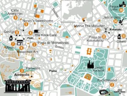 Psiri es buen lugar para cenar y tomar una copa —sobre todo para los más jóvenes—, pero también merece la pena cambiar de aires y buscar el contraste. Kolonaki es un barrio selecto y cuidado, con el precioso parque Lofos (10) en lo alto de la colina de Licabeto. El Oikeio (11) (Ploutarchou, 15) es un restaurante muy agradable, donde comí una musaka (pastel de carne y berenjena con tomate y bechamel) espléndida. Dando a la plaza de Kolonakiou (12) hay dos grandes y concurridos cafés donde la gente pasa allí el día entero, trabajando, haciendo crucigramas o leyendo. Más allá se encuentra el Minnie The Moocher (13) (Tsakalof, 6), un bar con música en vivo y cócteles. Cuando estuve, algunos clientes se daban aires de ser famosos y quizá lo fueran.