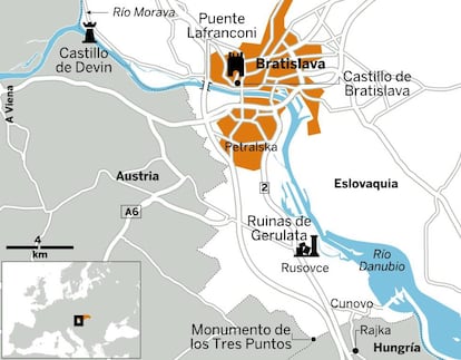 Entre sus no escasos atractivos, Bratislava tiene el de su posición geográfica: ser una encrucijada de Eslovaquia, Austria y Hungría. Desde 2007 los tres pertenecen al espacio Schengen de libre circulación de ciudadanos europeos. El Danubio desempeña ahí un gran papel. No se trata solo de traer y llevar nostalgia al estilo del Imperio Austrohúngaro de Berlanga. El puente Lafranconi, inaugurado en 1992, fue el primero de Bratislava construido con cemento y presta un perfil de clásica solidez a la capital de Eslovaquia, que no se ha quedado anclada ni en añoranzas austrohúngaras ni soviéticas, ni siquiera de cuando formaba parte de Checoslovaquia. Tampoco es que reniegue de cuanto bueno puede sugerir el pasado. El puente lleva el nombre del conde Enea Grazioso Lafranconi, experto en obras fluviales. Arregló el problema de las inundaciones en la ciudad. Mejoró el cauce y el tráfico del río, y no dudó en eliminar 11 islas fluviales. Otro gran puente —de los cinco que hay— es el llamado puente Nuevo, de 1972, con un observatorio y restaurante en una plataforma elevada con forma de platillo volante.