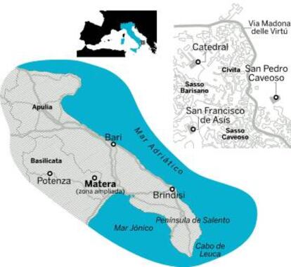 La materia prima es inmejorable. Matera, capital de la provincia (una de las dos que tiene Basilicata: Matera y Potenza), se ha triplicado desde los tiempos de Levi (tiene ahora 60.000 habitantes), pero conserva la misma magia y casi la misma estampa: en el barrio alto o Civita, despunta la catedral románica, arropada por otros templos y palacios del casco viejo. Este se ve entallado por dos profundos tajos, con sus respectivos barrios, el Sasso Barisano y el Sasso Caveoso. En este último se mantienen intactas (mejor dicho: recuperadas) las viviendas trogloditas que se escalonan por la pendiente hasta descender a la Gravina (barranco). Desde la breve explanada de la iglesia de San Pedro se tiene la mejor vista de la urdimbre de casas en cascada. Las viviendas, excavadas en la toba o tufo volcánico, podrían compararse a las casas-cueva de Guadix, y casi todas son ahora restaurantes, bares o incluso hoteles de toque singular.