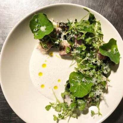 Aun así, ningún cliente puede llegar con ideas preconcebidas. La cocina de Alcalá, fruto de la espontaneidad, es la propia de un gourmet entusiasta de los vinos y de la comida. Maneja una enorme biblioteca de sabores, combina aderezos locales y lejanos, y logra composiciones atrevidas. Las vieiras soasadas las presenta con aliño de grosellas encurtidas y flores de tagete, un bocado chispeante. El lomo de corvina salvaje asada, sobre un gazpacho de nectarinas con rabanitos, es un juego de contrastes agridulces, y el tartar de gambas blancas, sobre un gazpachuelo taiwanés con verdolagas, resume las esencias del sureste asiático superpuestas a un caldo de pescadores malagueño. Lo local y lo global en cada uno de sus bocados. Fusión que vuelve a aparecer en la ventresca de atún al carbón con mantequilla de albahaca tailandesa, y alcanza la apoteosis con su soberbia col asada, repleta de umami. Alcalá maneja las frutas con especial maestría, como demuestra con las moras en salmuera y cerezas granizadas al kirsch, absolutamente brillante.