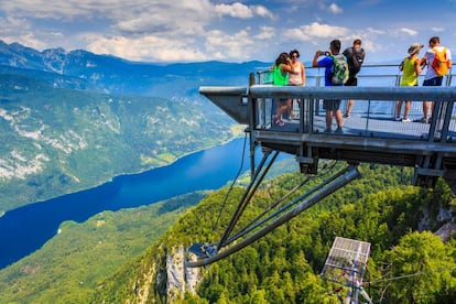 Bled es un centro turístico en el que uno puede alojarse en un glamping —feliz neologismo que designa un camping lujoso—, llegar a la isla en pletna —una embarcación tradicional de madera—, recorrer la orilla del lago en carruaje, jugar al golf o probar en una terraza su kremšnita, pastel de crema y hojaldre. A media hora en coche, hacia el interior de los Alpes, se encuentra Bohinj, otro lago. Vendría a ser el hermano aventurero del coqueto Bled. Su belleza, más agreste, atrae a los puristas del paisaje. Suele ser el destino preferido de los excursionistas más exigentes, los que se despiertan al alba, llevan en sus mochilas alimentos ricos en proteínas y aseguran que duermen más a gusto en camastros de refugios que en camas king size de hoteles.