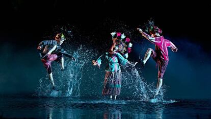 Corceles galopando a orillas de lo que parece ser un río, el Tajo, pero puede ser el mar, de cuyo vientre emerge entera una carabela, o dos órganos enfrentados, lanzando arpegios de fuego. Una catedral gótica dibujada en el aire con solo chorros de agua y luz. Un tropel de cuerpos que igual se agitan en contorsiones moriscas que en frenéticas danzas del Nuevo Mundo o ritmos de foxtrot. Una música envolvente, de película, que a pesar de los guiños y melismas raciales evoca la atmósfera orientalista de Lawrence de Arabia…